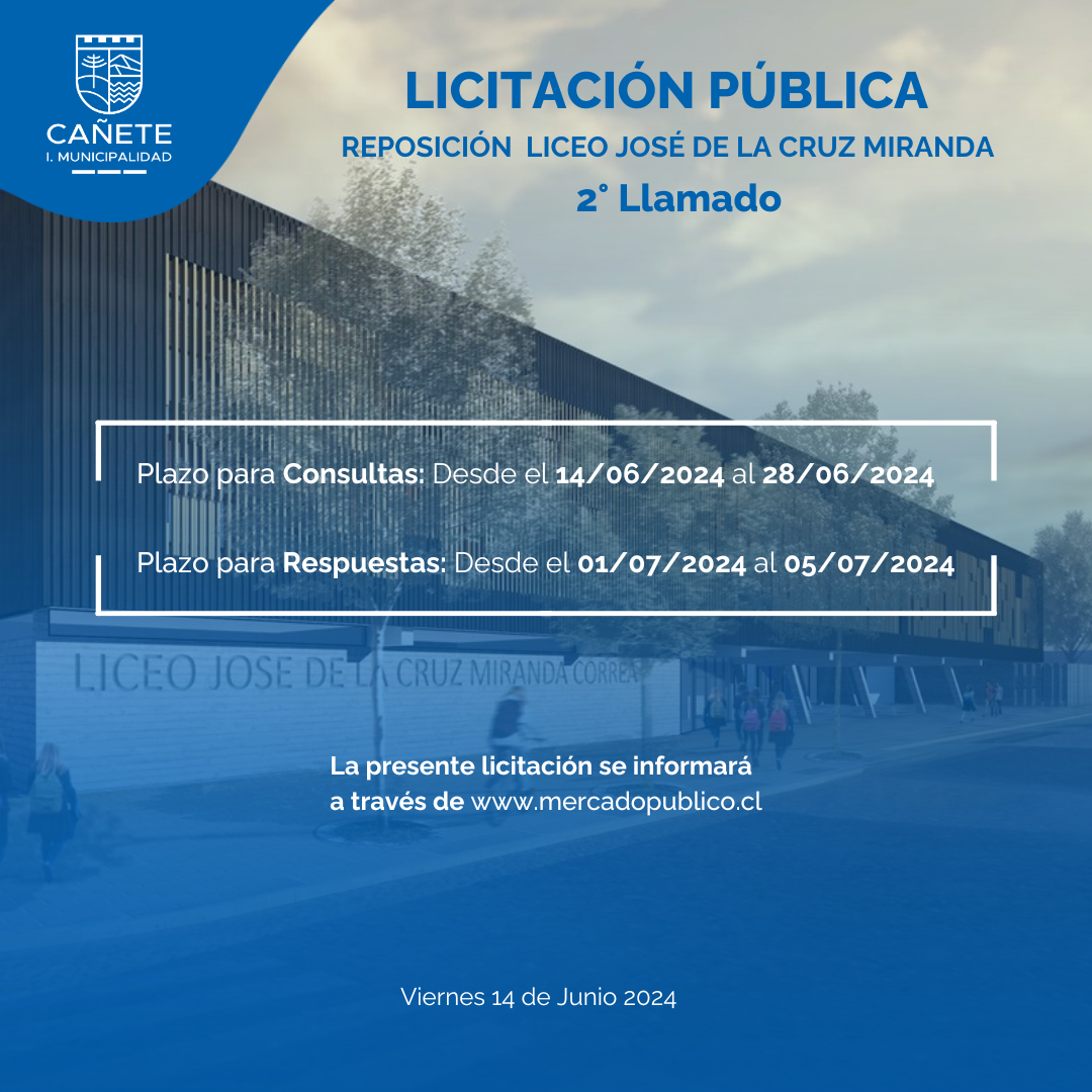 Gracias a la incansable gestión del alcalde Jorge Radonich, la comuna de Cañete avanza un paso más hacia la concreción del esperado nuevo Liceo José de la Cruz Miranda (B-56). En este segundo llamado a licitación, se invita a las empresas a postular a través de Mercado Público para la adjudicación de la construcción de un moderno edificio de 3 pisos.
