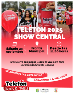 La Ilustre Municipalidad de Cañete, a través de la Oficina de Discapacidad y la Oficina de Actividades Municipales, invita a toda la comunidad a disfrutar de una jornada llena de música, juegos y presentaciones en vivo.  Sábado 29 de noviembre Frontis Municipal Desde las 11:00 horas ⸻ PROGRAMACIÓN 11:00 hrs — Apertura del Himno Teletón 202511:15 hrs …