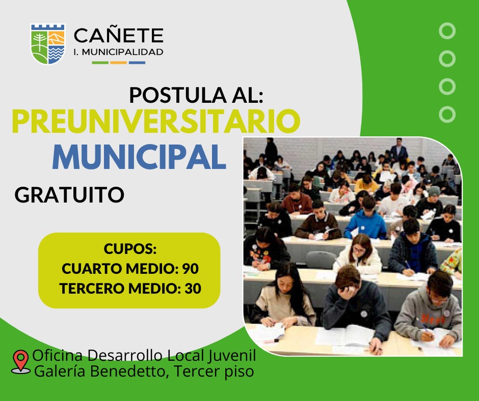 El alcalde Jorge Radonich, por medio de la Oficina de Jóvenes informa a la ciudadanía que a partir del 08 hasta el 30 de abril estará abierto el proceso de inscripción para el Preuniversitario Municipal Gratuito perteneciente al año 2024. Dicho plan está orientado a las personas que estén cursando Cuarto año de Enseñanza Media, y para las personas egresadas de Enseñanza Media.