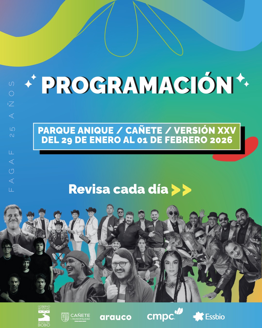 La Ilustre Municipalidad de Cañete invita a la comunidad y a quienes visitan la comuna a conocer el programa oficial de la Feria Agrícola, Ganadera y Forestal (FAGAF) en su XXV versión se desarrollará en Parque Anique, entre los días 29 de enero y 1 de febrero.