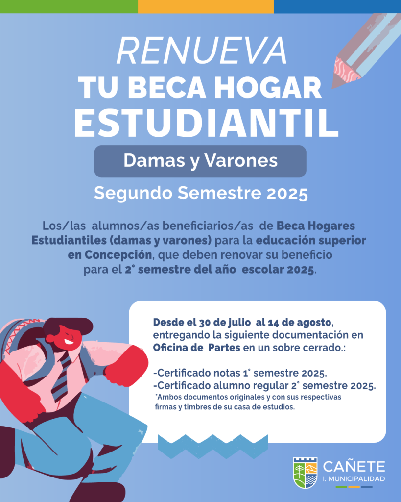 La Ilustre Municipalidad a través de Oficina de Becas y Hogares Estudiantiles que los/las alumnos/as beneficiarios/as de Beca Hogares Estudiantiles (damas y varones) para la educación superior en Concepción, se les recuerda que deben renovar su beneficio para el 2° semestre del año escolar 2025.