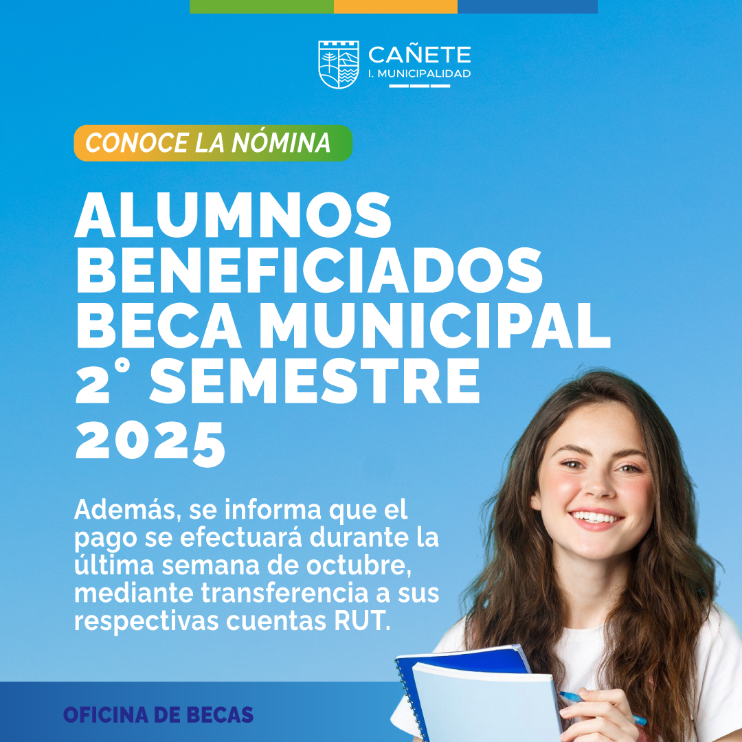 La Oficina de Becas de la Ilustre Municipalidad de Cañete, a través del alcalde Jorge Radonich Barra, informa el listado de estudiantes beneficiarios de la Beca Municipal correspondiente al segundo semestre del presente año, beneficio que contempla el período comprendido entre los meses de septiembre y diciembre.