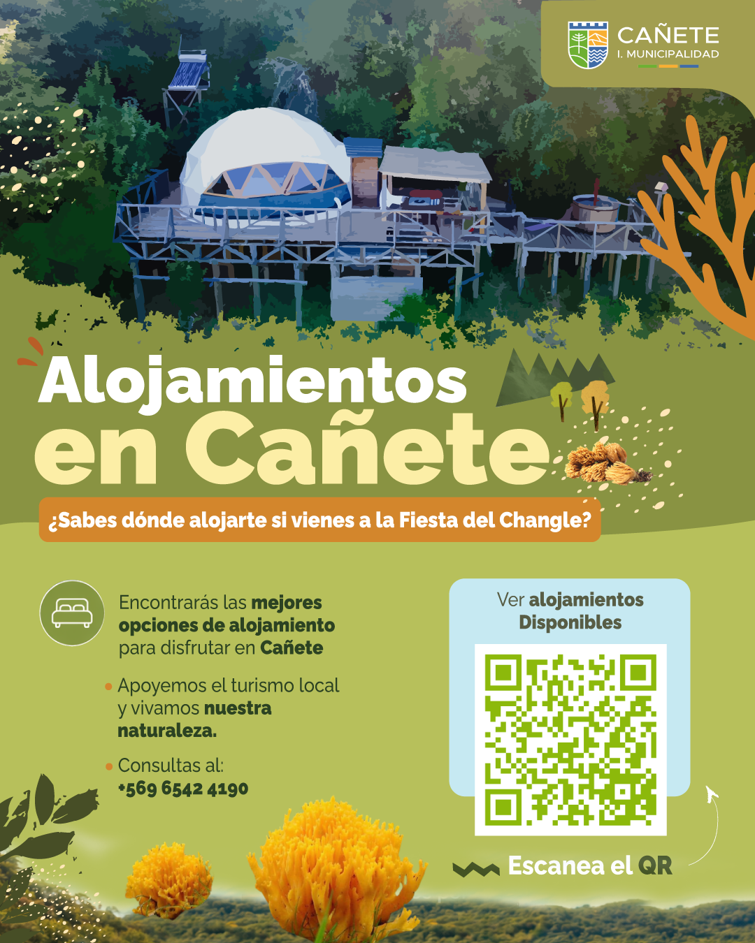 ¿Sábes dónde alojarte si vienes a la Fiesta del Changle? 27/04/2026 ¿Vienes a la Fiesta del Changle? ¡Tenemos el lugar perfecto para que descanses y disfrutes al máximo! –Conecta con la naturaleza.-Opciones cómodas y acogedoras.–Apoya el turismo local.–Vive una experiencia única en Cañete. ¡Escanea el código QR y descubre todos los alojamientos disponibles! Un paso más cerca de tu escapada perfecta Consultas: +569 6542 4190 ¡Te esperamos para vivir la magia del sur! Vistas: 36