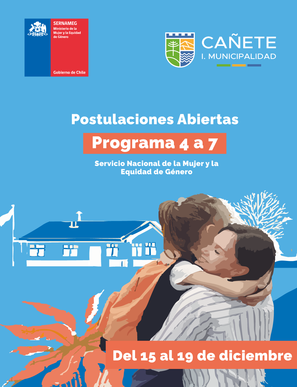 La Ilustre Municipalidad por medio del Programa 4 a 7 y SERNAMEG, invitan a la comunidad a ser parte del Programa, a partir del 15 de diciembre se abre la convocatoria, el cual proporciona un lugar seguro y didáctico a niños y niñas de 6 a 13 años que estén a cargo de mujeres económicamente activas y así asegurar su participación en el mercado laboral.