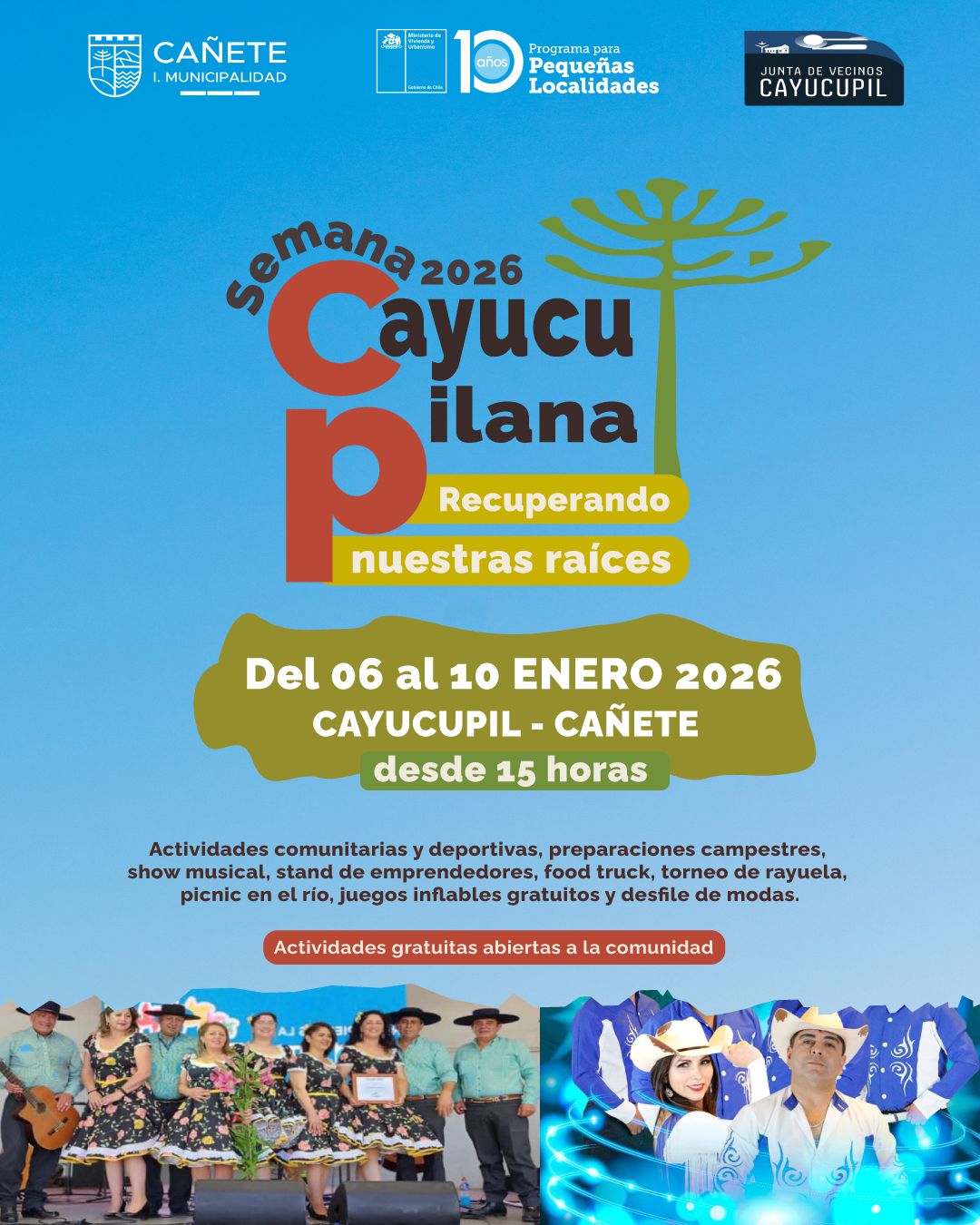 La Ilustre Municipalidad de Cañete, a través del Programa para Pequeñas Localidades Cayucupil, junto a las organizaciones de Cayucupil, invita cordialmente a toda la comunidad a participar de una semana llena de encuentro, tradiciones, recreación y vida comunitaria 🤝🎶🌳