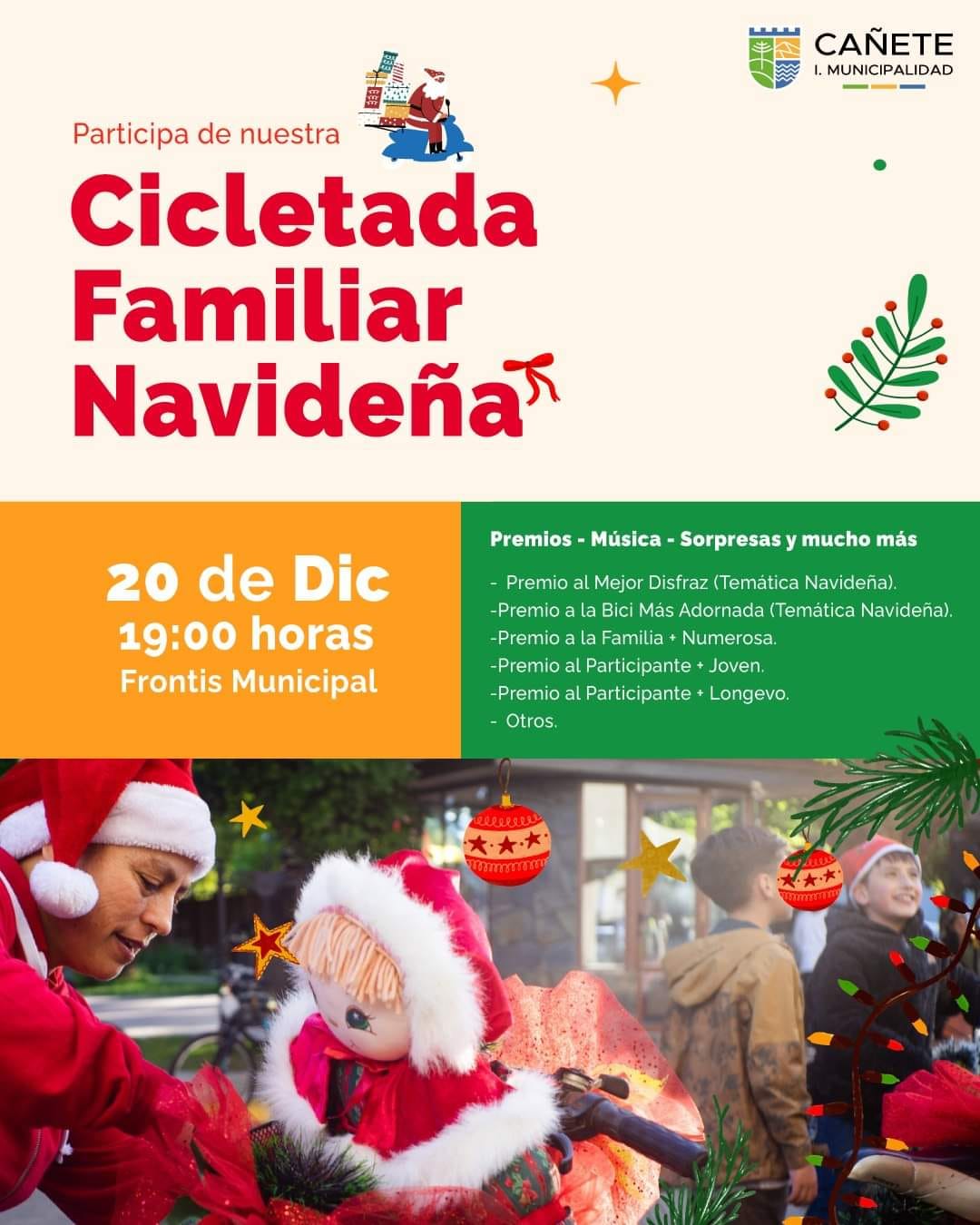 La Ilustre Municipalidad de Cañete, a través de la Oficina de Deportes y el Instituto Nacional de Deportes (IND), invita a toda la comunidad a ser parte de la Cicletada Familiar Navideña Cañete 2024, que se llevará a cabo el viernes 20 de diciembre a las 19:00 horas, con salida desde el frontis del Municipio.